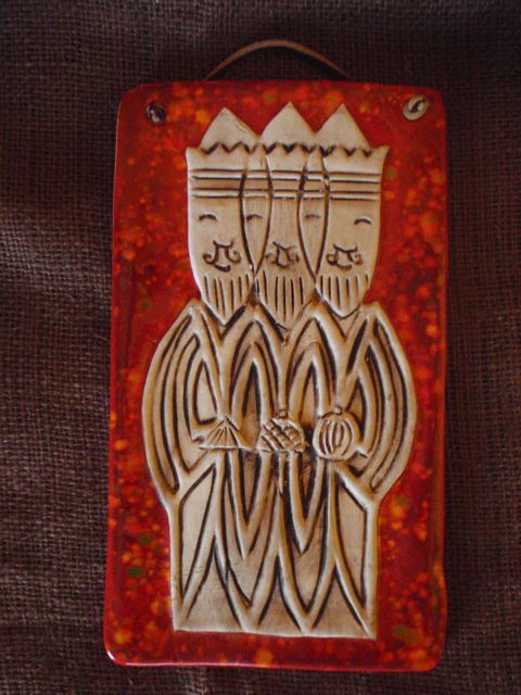 Ceramic slab with carving 3 wise men. Painted with wash and glaze with crystals. Comes with leather rope to hang on wall.