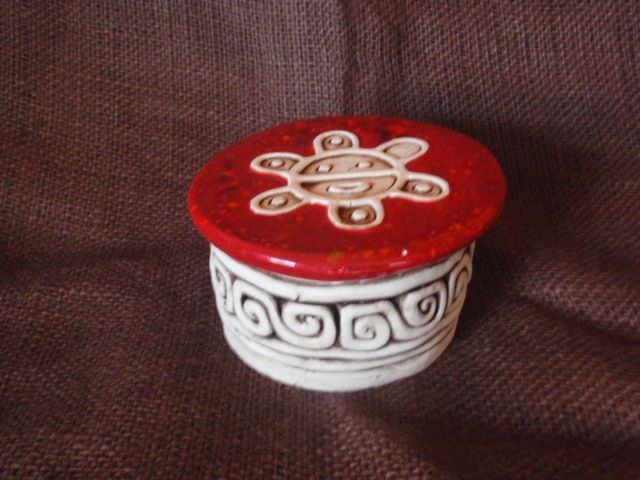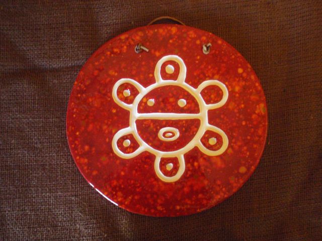 /Ceramic slab with carving of Camuy sun petroglyph, from the town of the same name. Painted with wash and glaze with crystals. Comes with leather cord to hang on wall.