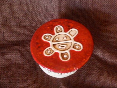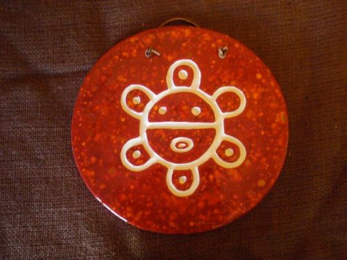 DESCRIPCIÓN/DESCRIPTION: Plancha de barro con tallado de petroglífo de Sol de Jayuya, del pueblo del mismo nombre. Este petroglifo se encuentra en el Mural Indígena de Zamas, ubicado en el barrio del mismo nombre, en Jayuya. Pintada con wash y esmalte con cristales. Viene con soga de cuero para colgar en pared.
