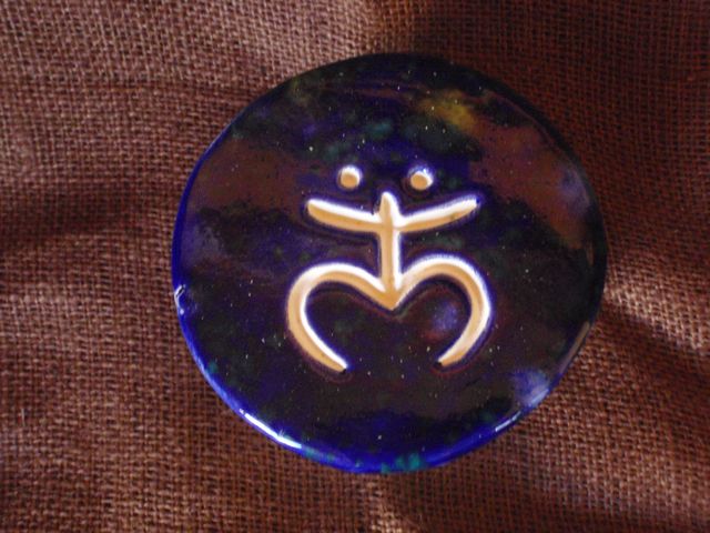 /Ceramic slab with carving of Sunpetroglyph, the Taíno godess of fertility. painted with wash and glaze with crystals. Comes with leather cord to hang on wall.